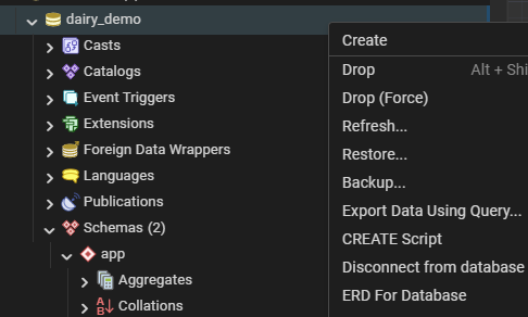 dairy_demo. Отдельный namespaceappне требуется — все таблицы создаются внутри базы данных.